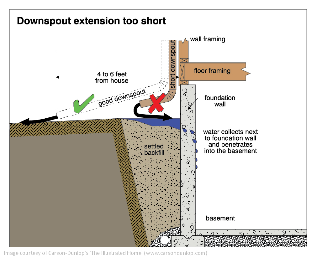 Downspout extensions are not aesthetically pleasing but crucial for a dry basement. Discharging water from a downspout directly adjacent to a foundation is a recipe for damage. By adding a simple extension to the bottom of the downspout we can safely direct this mass of water at least 4 feet away from the foundation and ideally onto a properly sloped lot that will continue to lead the water even further away. This finding is part of almost every home inspection report.