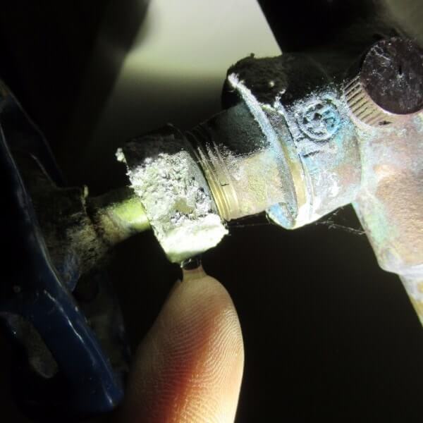 A couple other common findings are metal hangers used to support copper pipe. When dissimilar metals are in direct contact corrosion will occur; however, brass is okay to be in contact with copper. Simply use some electrical tape to add a layer of separation.