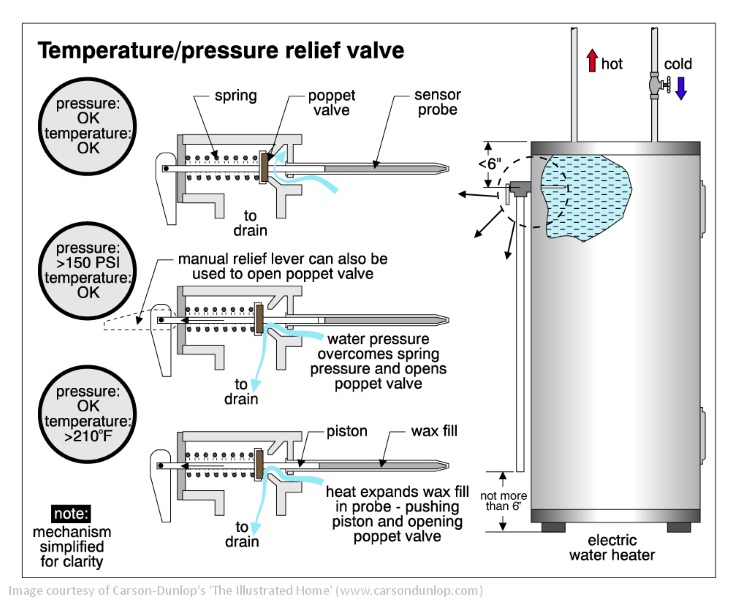 Every water heater should have a TPRV (temperature pressure release valve). When the temperature, or pressure, goes beyond a pre-set point inside the tank it can be released through this valve. When this valve is not present the pressure can build up and turn your water heater into a dangerous projectile; there have been reports of tanks going through two stories, out the roof and another 30 feet in the air!